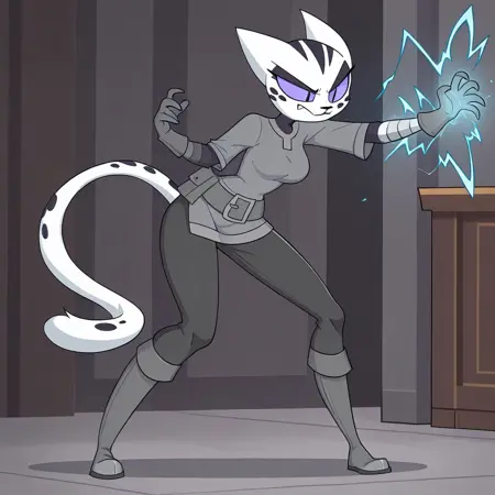 Mage: WSMage, white fur, purple sclera, slit eyes, gray shirt, bandaged arms, gloves, belt, pants, knee boots, spots, spotty tail