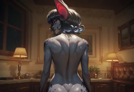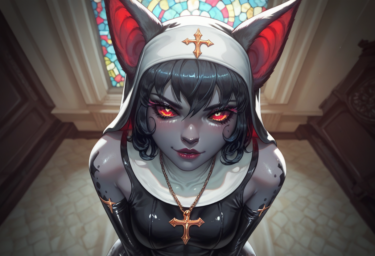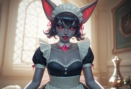 herzha-batgirl, 1girl, monster girl, colored skin, grey skin, animal ears, black skin, colored sclera,