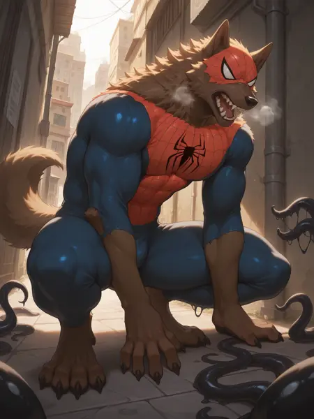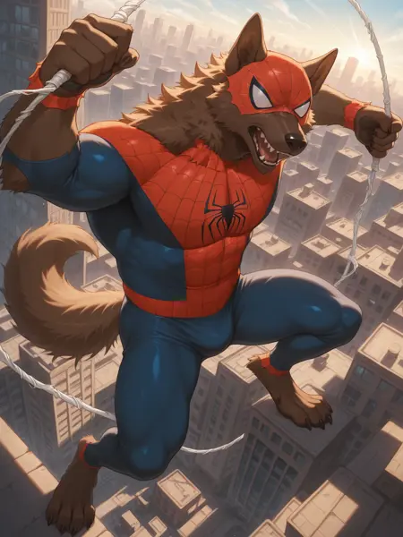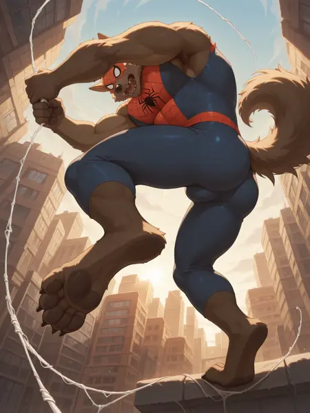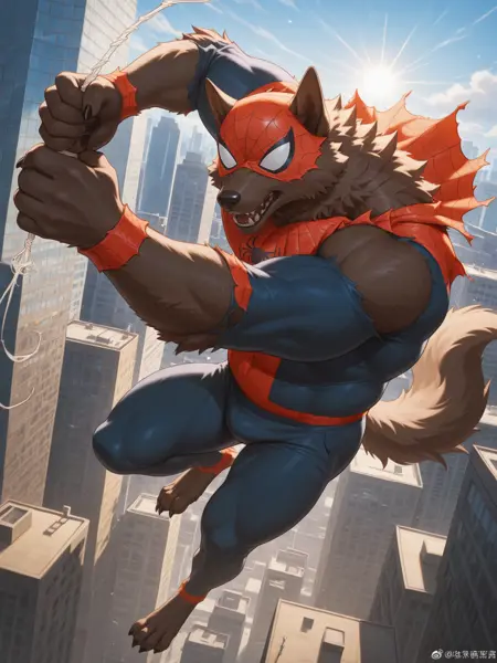 선택 사항/Optional:1boy,solo,furry,male focus,werewolf,bara,muscular,furry male,mask,wolf-spider uniform,pants,tail,swinging,web-swinging,spider web,spider-man pose,