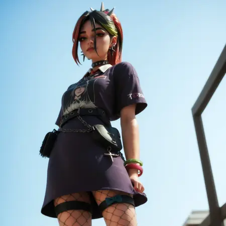 Outfit Prompts : dress, dress print, choker, bracelet, studded bracelet, collared shirt, necktie, fishnets pantyhose, belt, thigh strap, belt pouch, cross earrings, shorts under dress