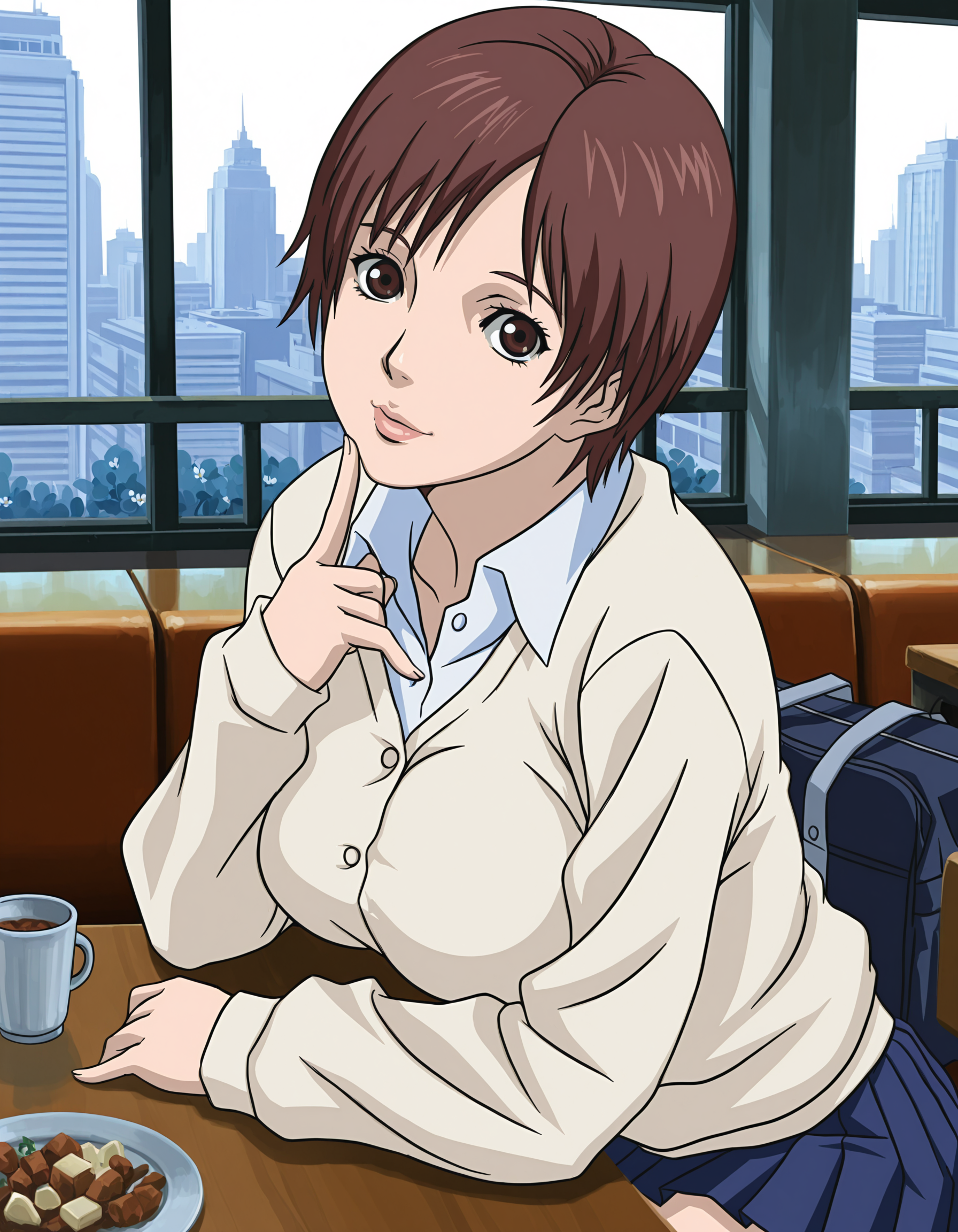 制服:制服、カーディガン、白シャツ、シャツの襟、青スカート、白靴下、茶色のローファー