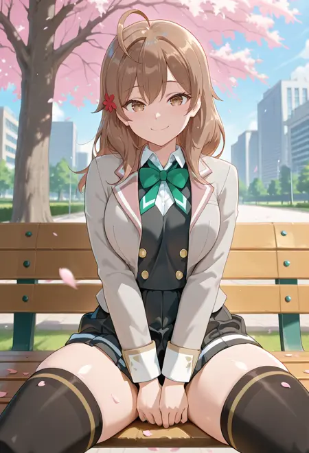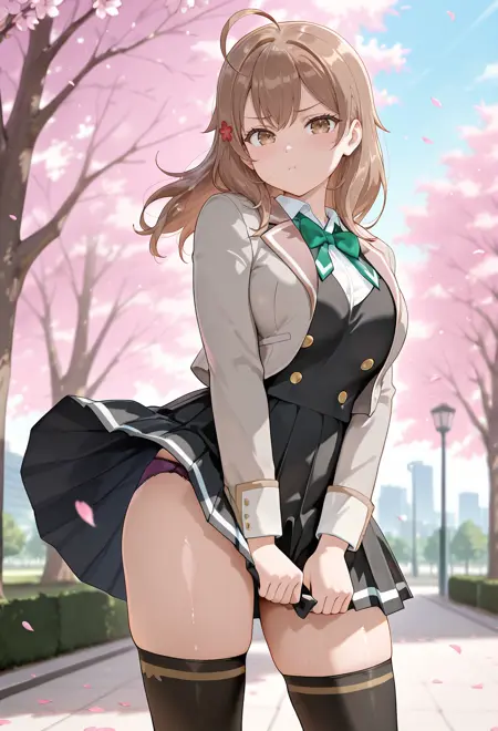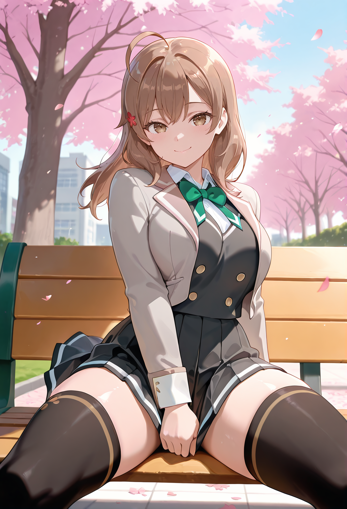 masha, 1girl, 棕色头发, 上衣, 校服, 外套, 棕色眼睛, 白色衬衫, 带领子的衬衫, 长发, (一朵红花), 长袖, 蝴蝶结, 绿色蝴蝶结, 灰色外套, 裙子, 过膝袜, 黑色过膝袜, 绝对领域, 百褶裙, 天线辫, 开襟外套, 大胸部