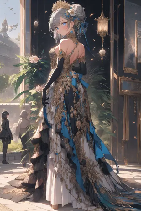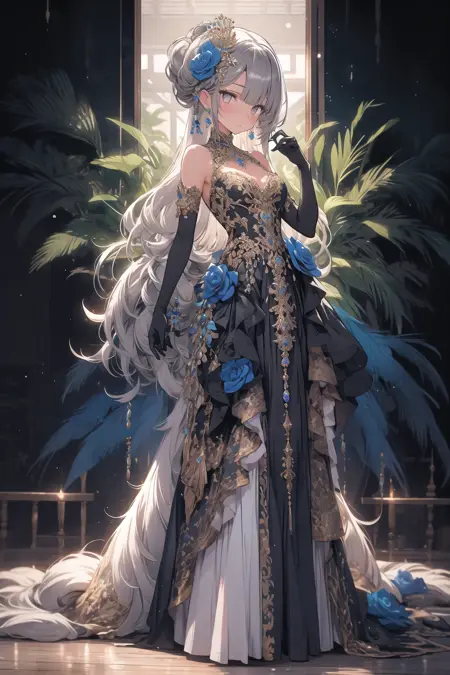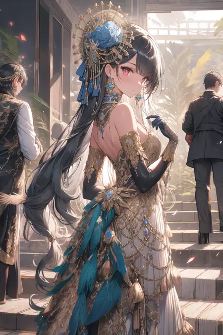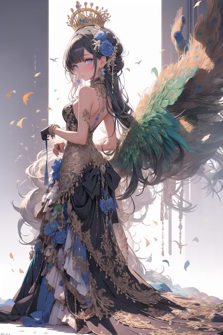 该模型可生成丰富的孔雀主题装饰,羽毛配饰与宝石共同构成奢华风格。模型名称源于我对这一场景的印象。
