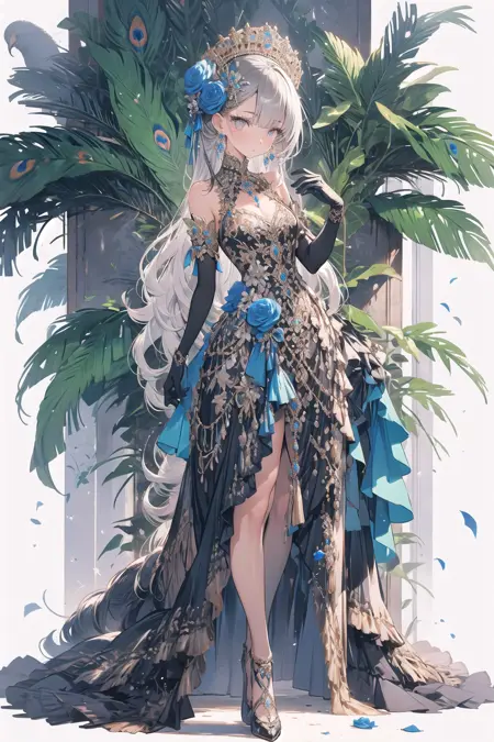 このモデルは、羽のアクセサリーと宝石が豪華なスタイルを形成する、豊かな孔雀テーマの装飾を生成できます。モデルの名前は、この情景に対する私の印象に由来しています。