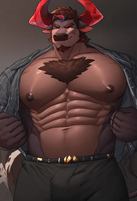 1boy,obsidius,bull,male focus,anthro,furry male,muscular male,bara,mature male,abs,large pectorals,nipples,muscular,bara,thick thighs,horns,chest hair,animal ears,cow ears,cow horns,facial hair,brown fur,tail