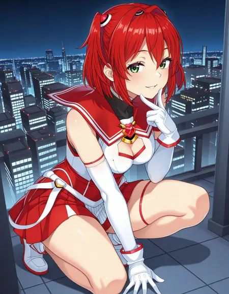 sonozaki akari, red hair, short hair, hair intakes, hair ornament, green eyes, Akari_Def, red sailor collar, cleavage cutout, black undershirt, pleated skirt, red and white skirt, elbow gloves, white gloves