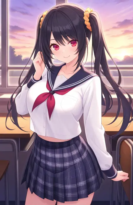 Cheshire(Inma_Shimai),1girl,solo, red eyes, black hair, breasts, twintails, Yellow scrunchie, long hair, large breasts,