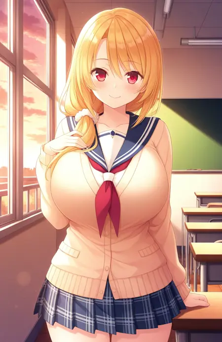 Carol(Inma_Shimai),1girl,solo, red eyes, blonde hair, huge breasts, long hair, white scrunchie, hair over shoulder,