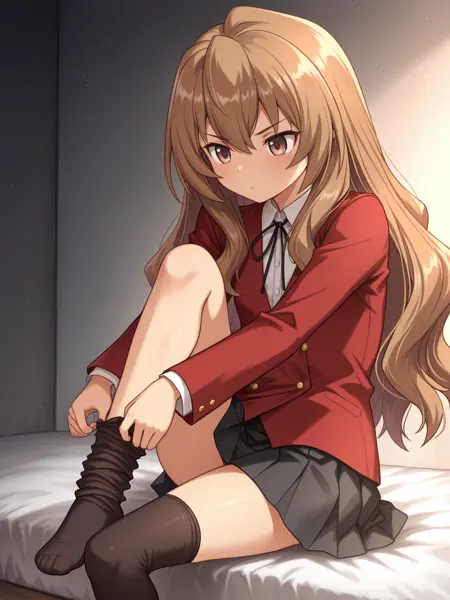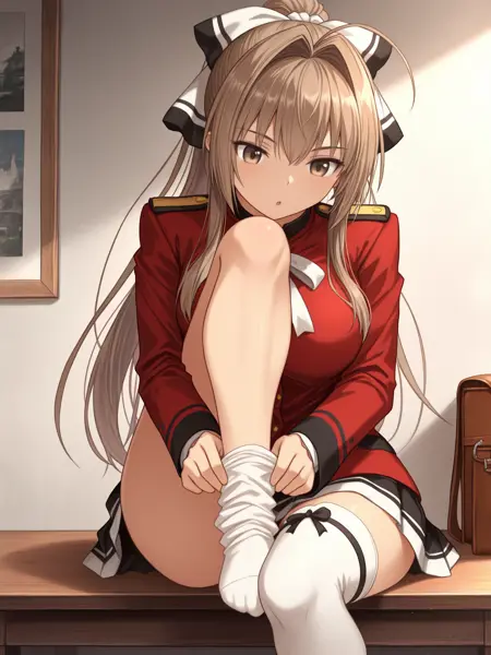 프롬프트: thighhighs pull at ankle, adjusting legwear