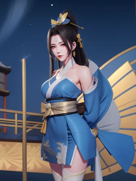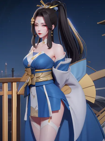 - 1girl, mature female, looking at viewer, cityscape, night, WZRYhuowuMY, hair ornament, sash, bow, jewelry, kimono, short skirt, forehead mark, hait stick, high ponytail, arms behind back, bare shoulders,