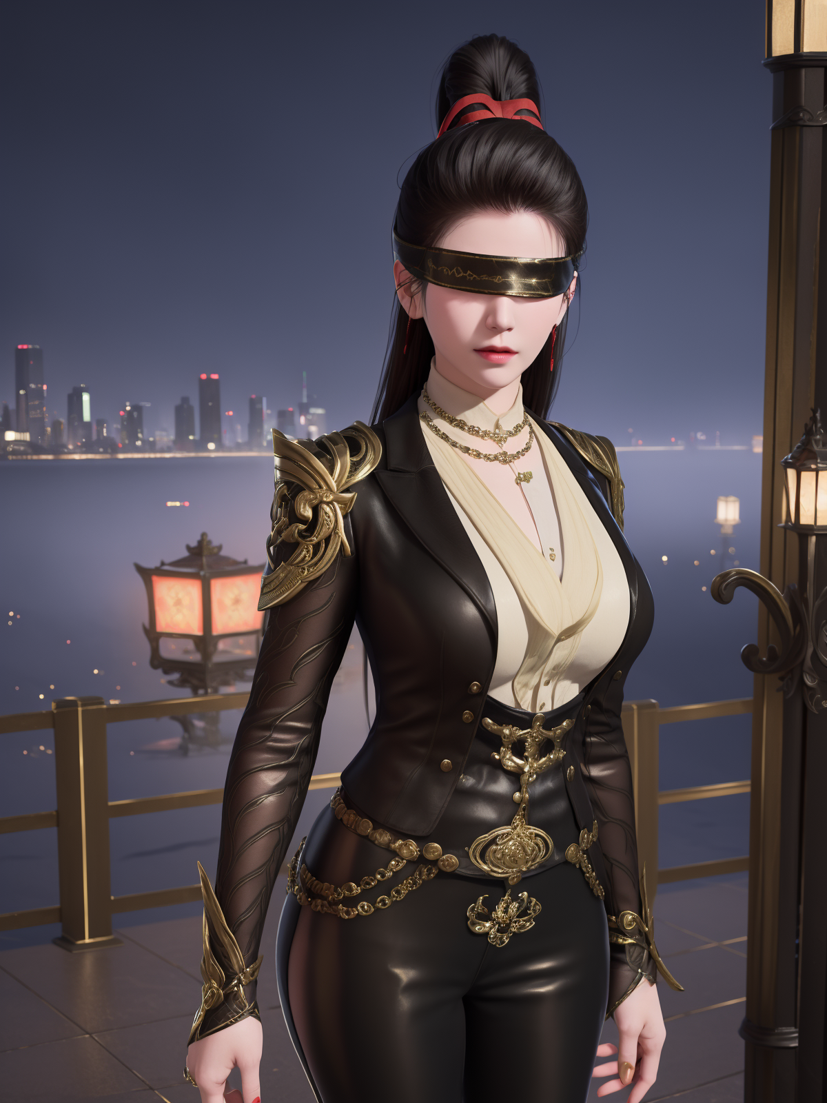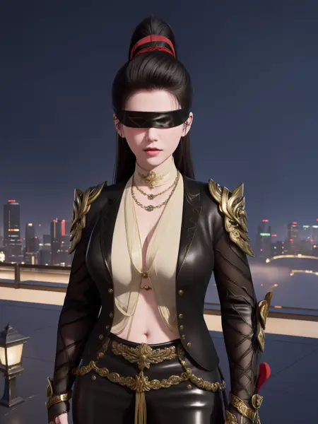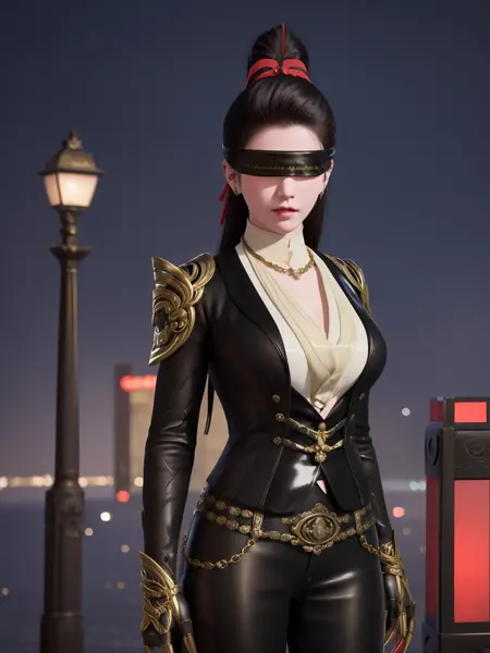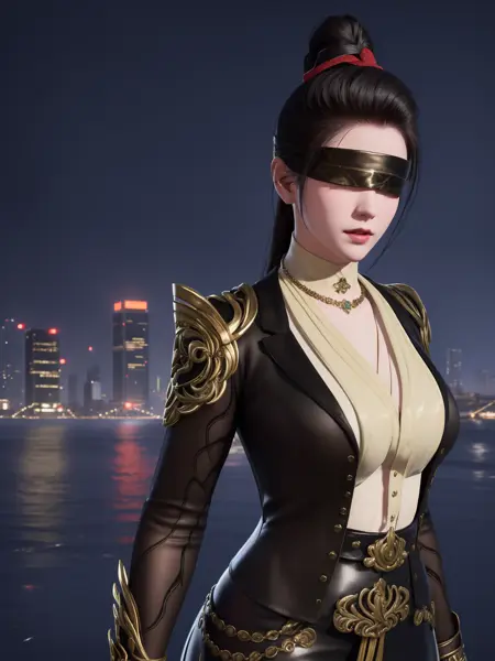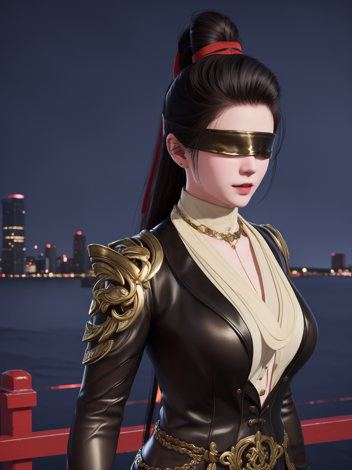 - 1girl, mature female, cityscape, night, looking at viewer, YJWJninghongyeCDXN, black blindfold, high ponytail, red ribbon, cowboy shot, black hair, armor, clothing cutout, jewelry, gem, shirt, jacket, belt, necklace, trim, hair bun,