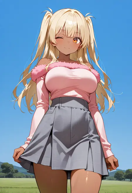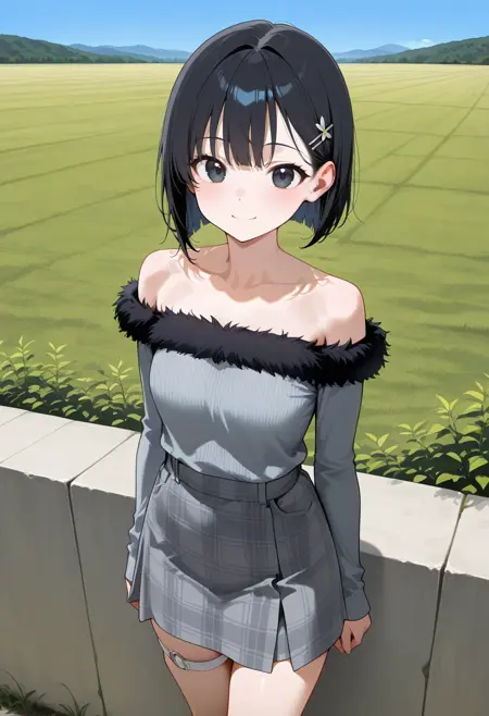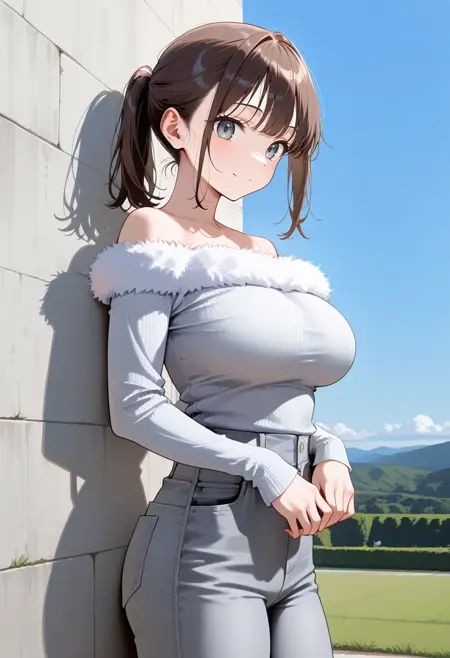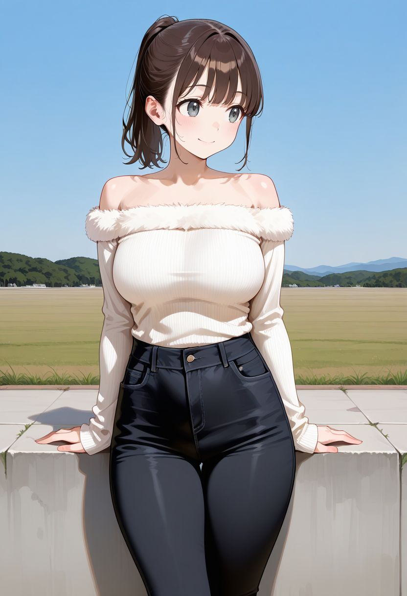 可愛らしいファーの付いたオフショルニットができるかもしれないLoRAです。