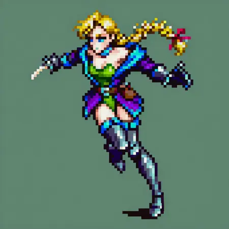 | 训练词汇 | 1girl, female focus, long hair, blonde hair, single braid, red ribbon, blue eyes, blue choker, green leotard, two-sided jacket, blue lining, purple jacket, belt, belt bag, gray gauntlets, gray thigh boots, harness top, female focus, medium breasts, off-shoulder jacket, waist-length jacket, gloves over sleeves, cinched jacket, belted jacket, belt over jacket, waist-fastened jacket, short jacket tails, fastened jacket,已复制! |