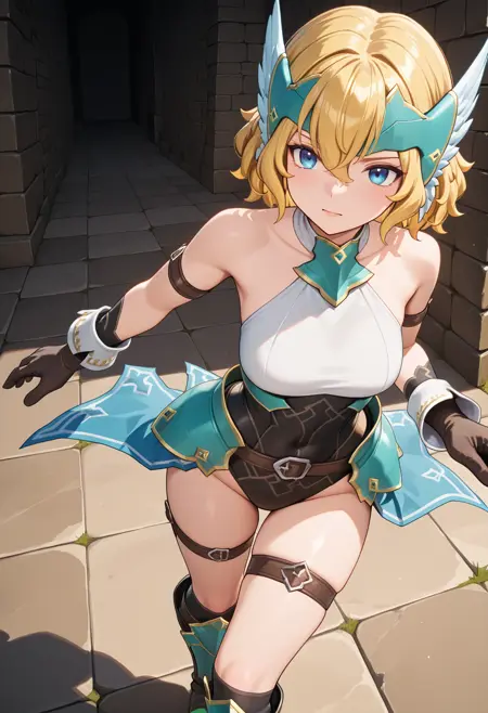 valkyrie, winged helmet, forehead protector, leotard, halterneck, sleeveless, bare shoulders, arm belt, black gloves, brown belt, waist armor, thigh strap, knee boots, armored boots