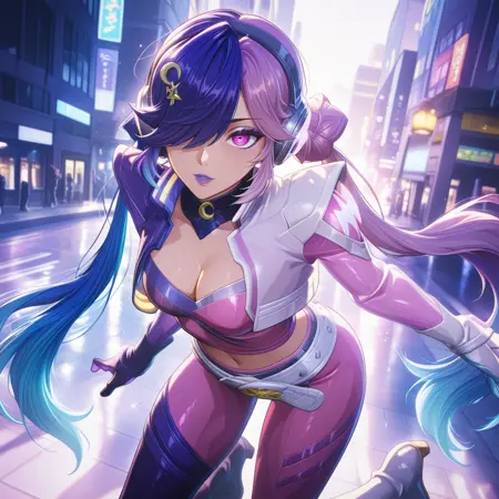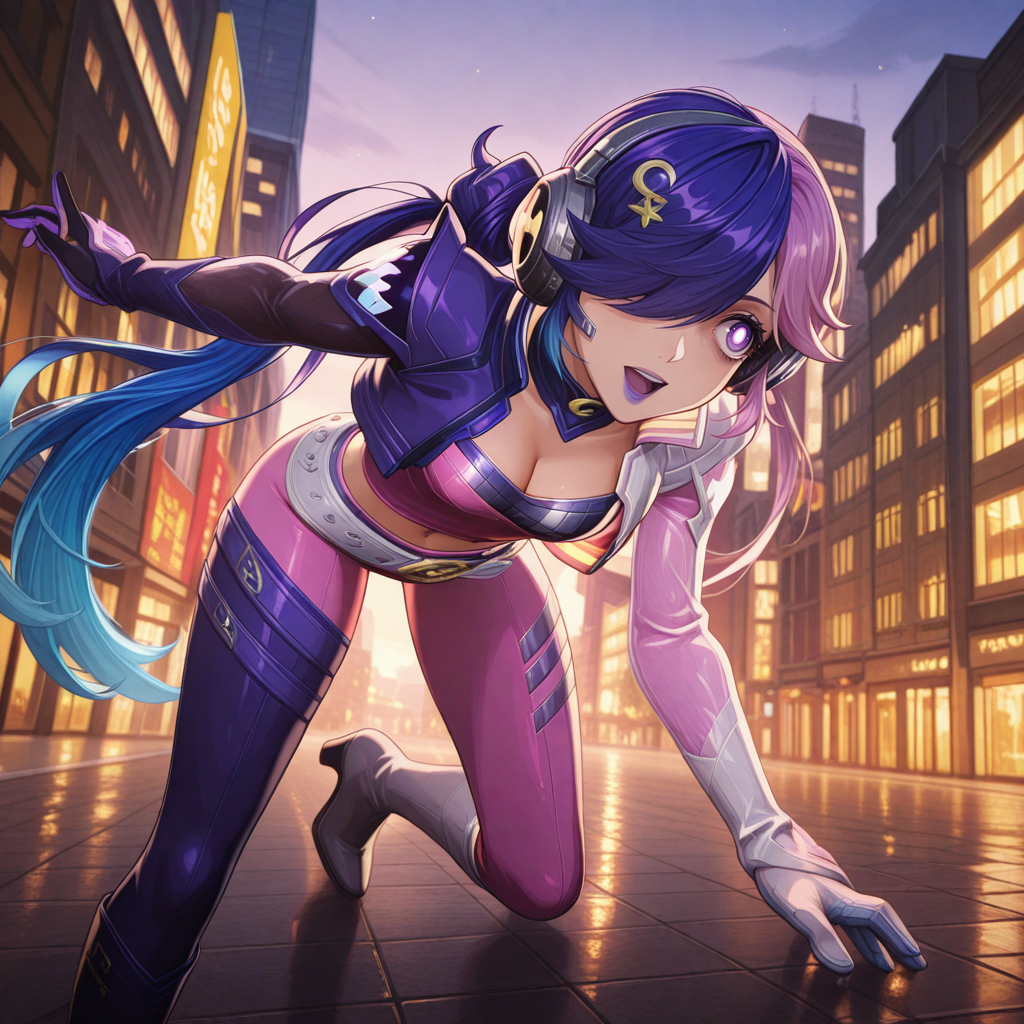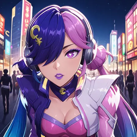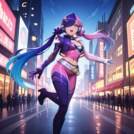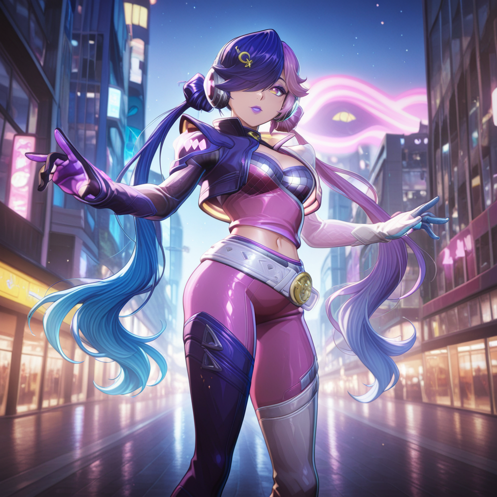 lun4m2099, 장갑, 보라색 머리, 다색 머리, 벨트, 재킷, 분홍색 머리, 긴 머리, 헤드폰, 파란색 머리, 메이크업, 한쪽 눈에 머리 덮인, 바지, 부츠, 바디수트, 립스틱, 매우 긴 머리, 보라색 입술, 아이섀도우, 짧은 재킷, 배꼽, 더블테일, 하이힐, 이색 머리, 머리 장식, 그라데이션 머리, 보라색 재킷,