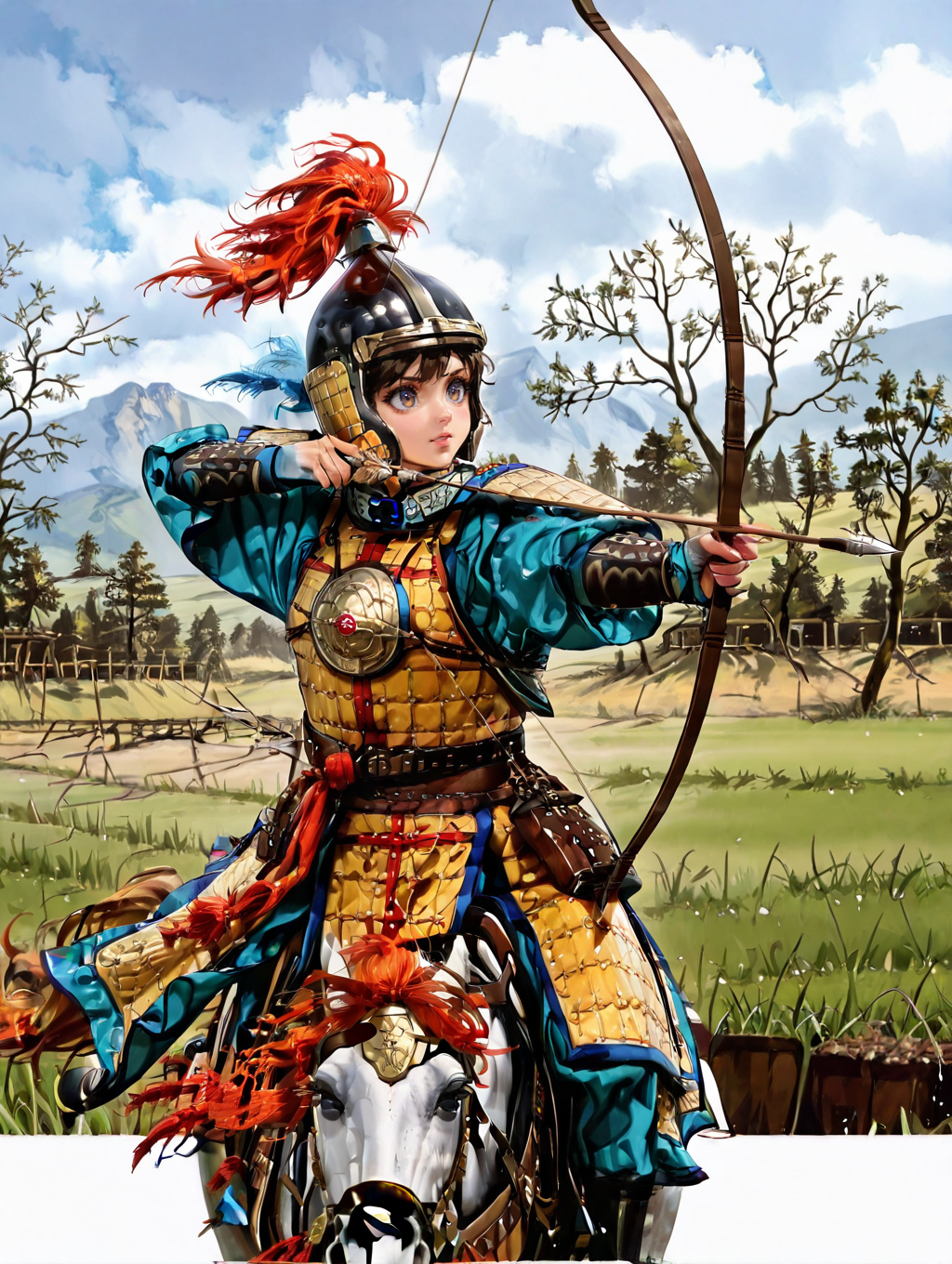 horseback riding, drawing bow, aiming,