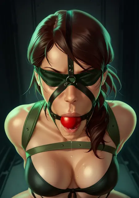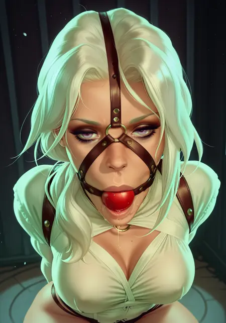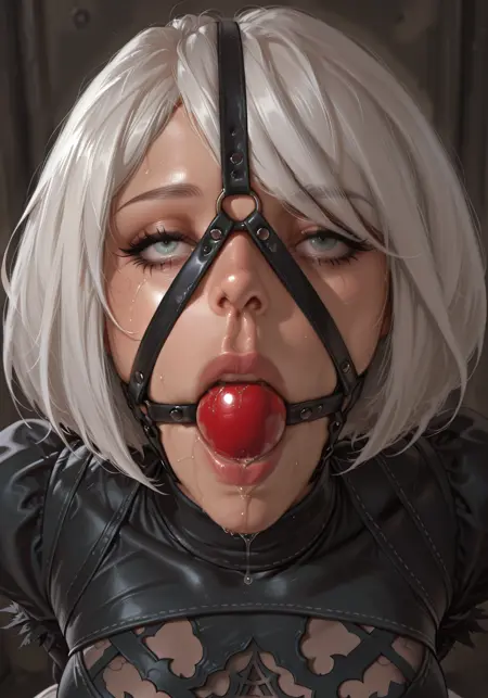 提示词:头戴式束缚、球形口塞、被堵住