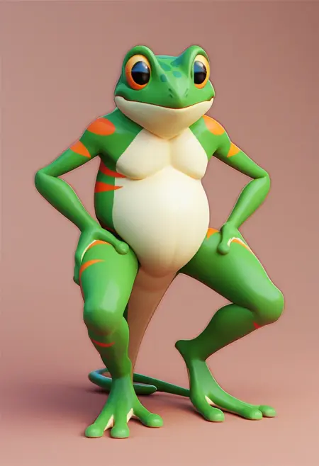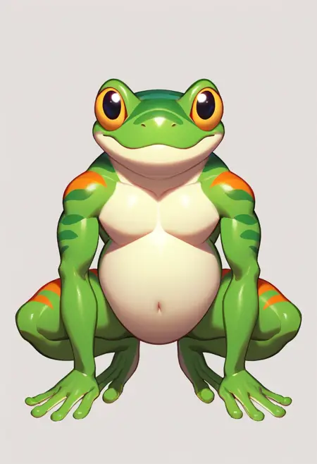 | Trained Words | Fro0gy, 1boy, green-skinned frog, round body, four limbs, thin limbs, webbed feet with two toes each, white underbelly, orange stripes around body, red dots on cheeks, has medium-large black eyes, pale yellow sclera, colored sclera, tail with a triangular tip,Copied! |