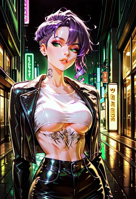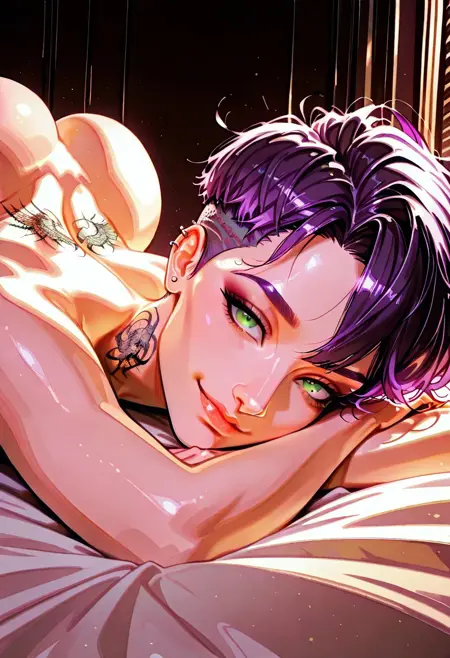 purple hair, mullet, short hair, messy hair, curly, undercut, (black)gradient hair, green eyes, beautiful lips, piercings, neck tattoo, medium breasts, slim, narrow waist