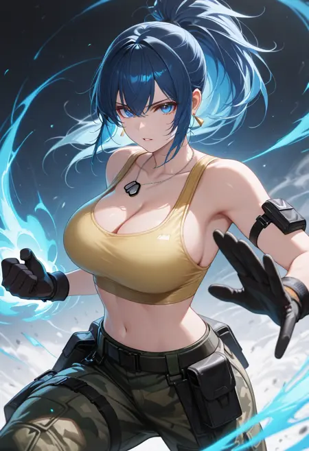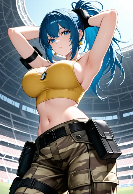 "LNHDRNKOF, 파란 머리, 큰 머리, 언더컷, 독태그, 노랑 텅크탑, 배꼽, 팔 주머니, 팔 끈, 벨트 주머니, 캠플라지 팬츠, 검은 장갑"