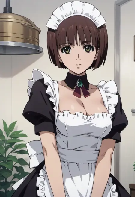 : 하라다 마코토, 단발, 갈색 머리, 녹색 눈