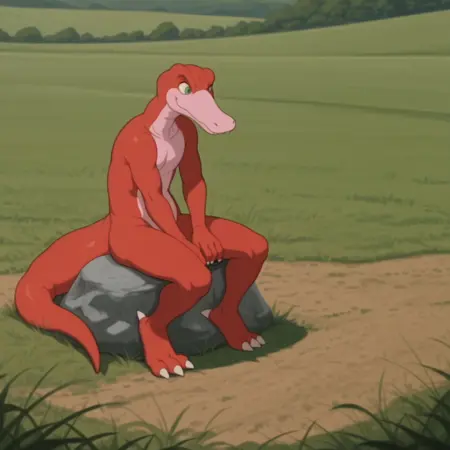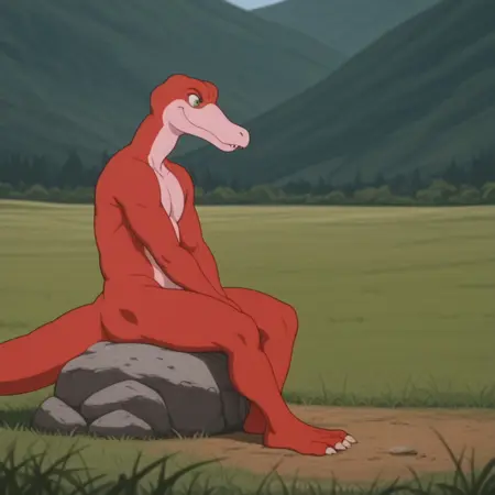 QuackpotDSil, anthro, male, hadrosaur, red skin, green eyes, blue bodysuit, purple collar, purple belt, blue bracers,