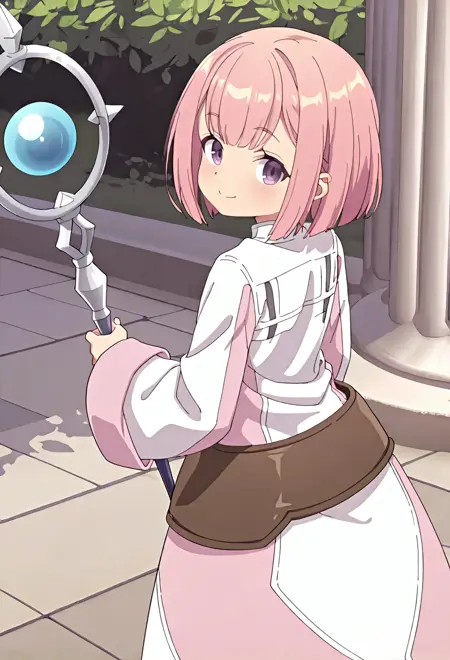 lululee-robe, lululee ashford, 보라색 눈, tareme, 분홍색 머리, 볼컷, 투톤 롱 로브, 흰색 로브, 분홍색 로브, 넓은 소매, 갈색 벨트, 갈색 허벅지 부츠