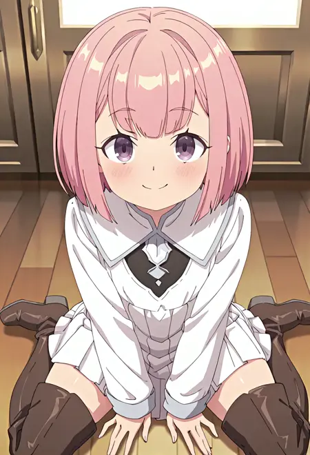 lululee-default, lululee ashford, 보라색 눈, tareme, 분홍색 머리, 볼컷, 흰색 드레스, 주름 드레스, 긴 소매, 갈색 허벅지 부츠