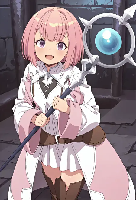 lululee-robe, lululee ashford,purple eyes,tareme,pink hair,bob cut,two-tone robe,white robe,pink robe,wide sleeves,brown belt,brown thigh boots