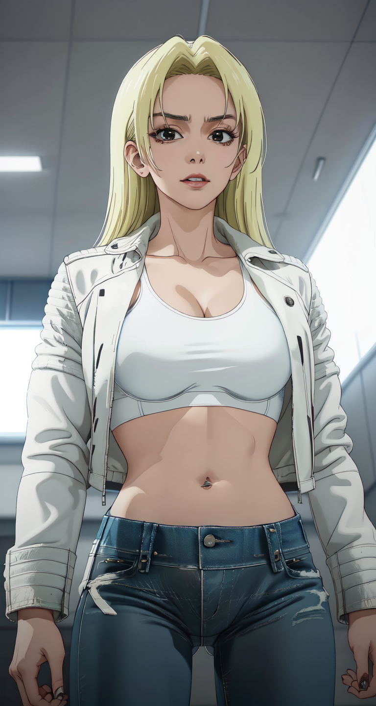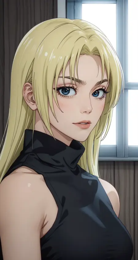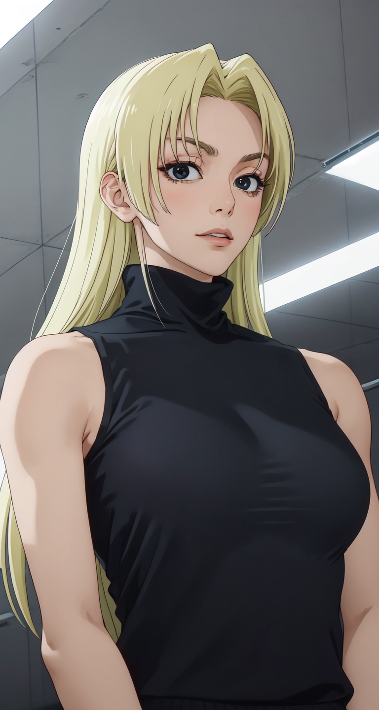 Prompt: YukiTsukumo, 1girl, blonde, long hair, female focus, solo, sleeveless turtleneck, lora:YukiTsukumo-01:1