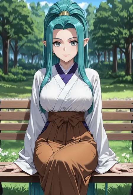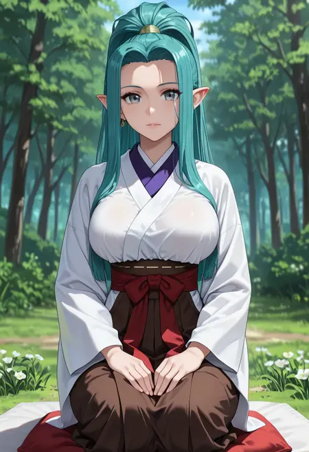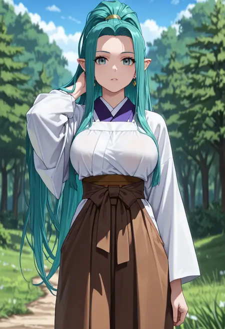 (long_hair, green_hair, blue_hair, aqua_hair, grey_eyes, green_eyes, pointy_ears, high_ponytail, ponytail, sidelocks, very_long_hair, jewelry, earrings:1.2),