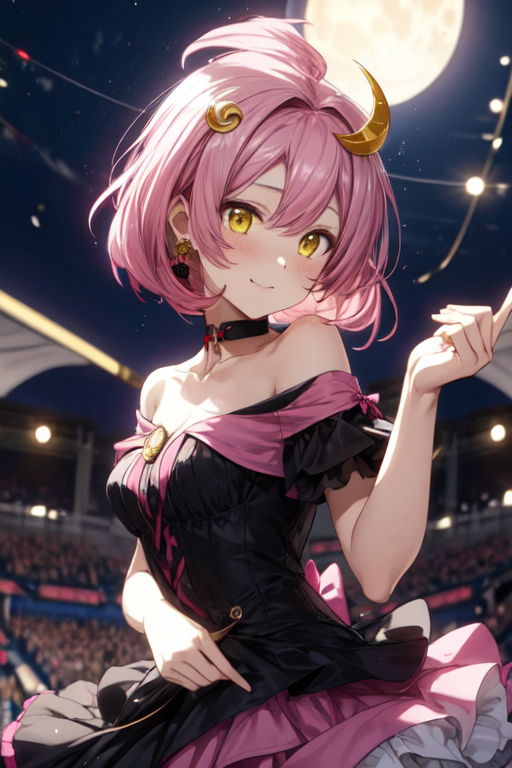 luna_1, shoulder-length pink hair, styled in the shape of a crescent moon, yellow eyes, small breasts, middle breasts, crescent hair ornament crescent choker, pink idol dress,