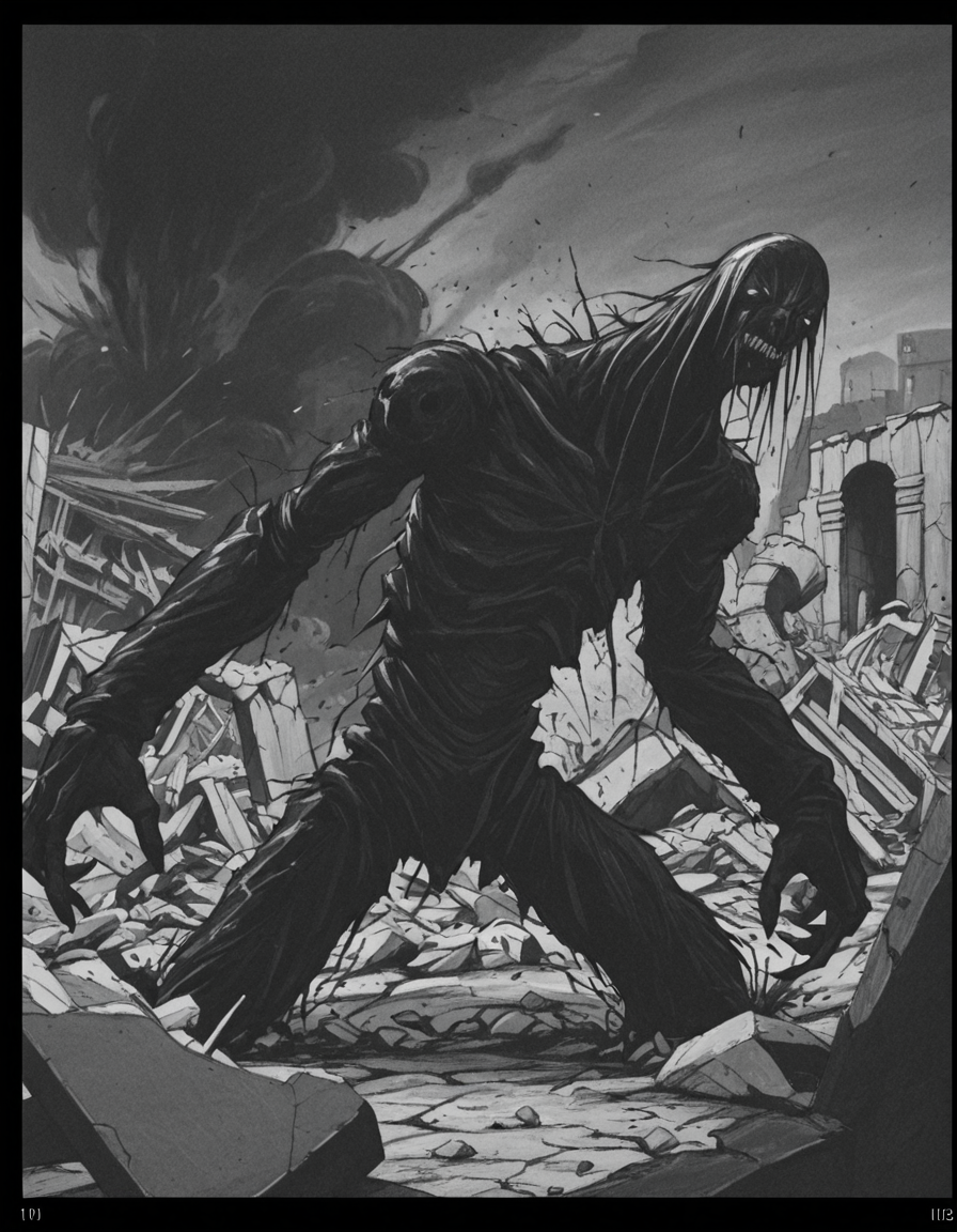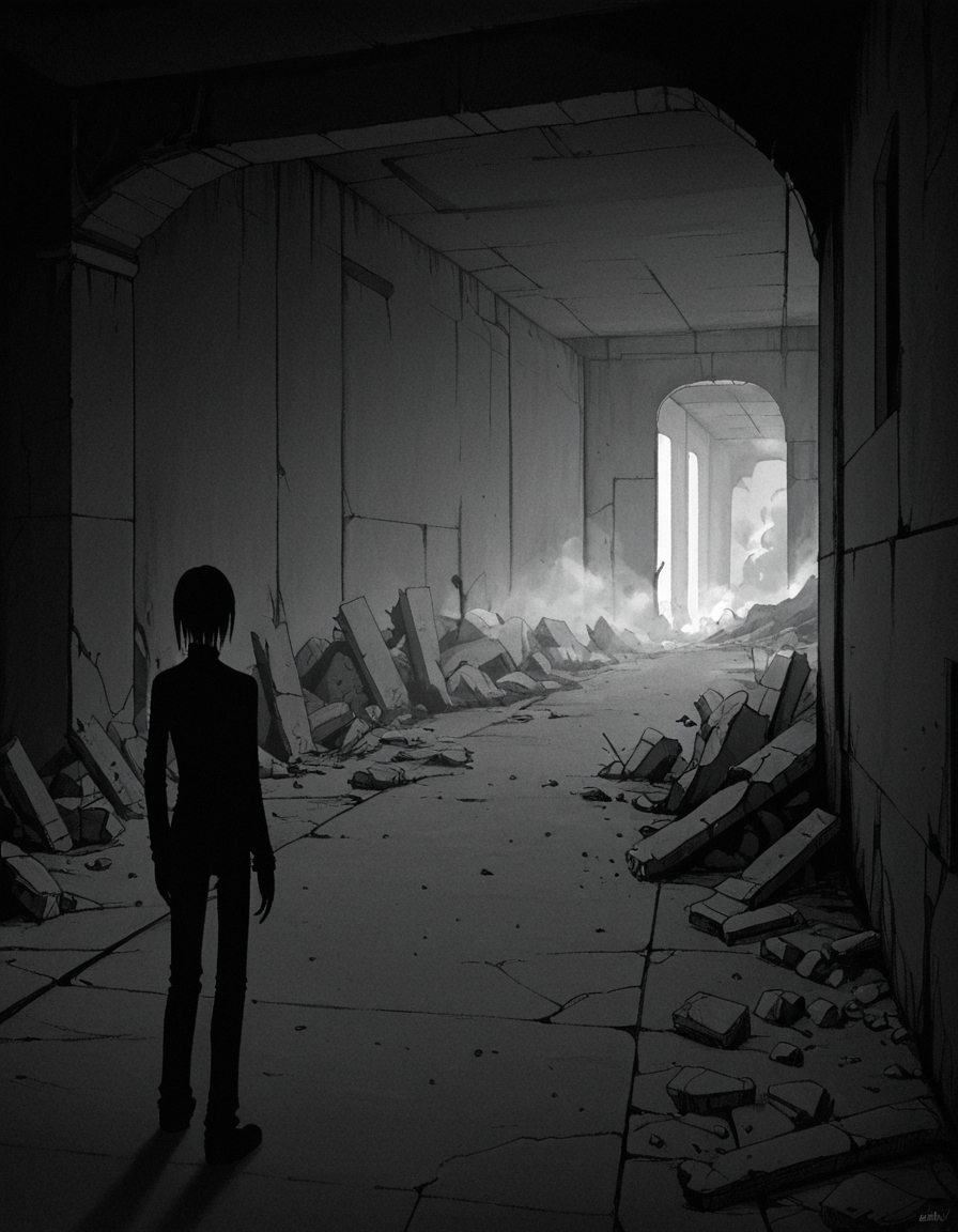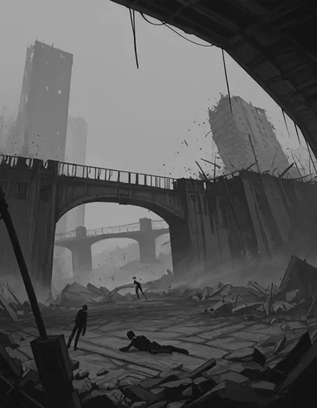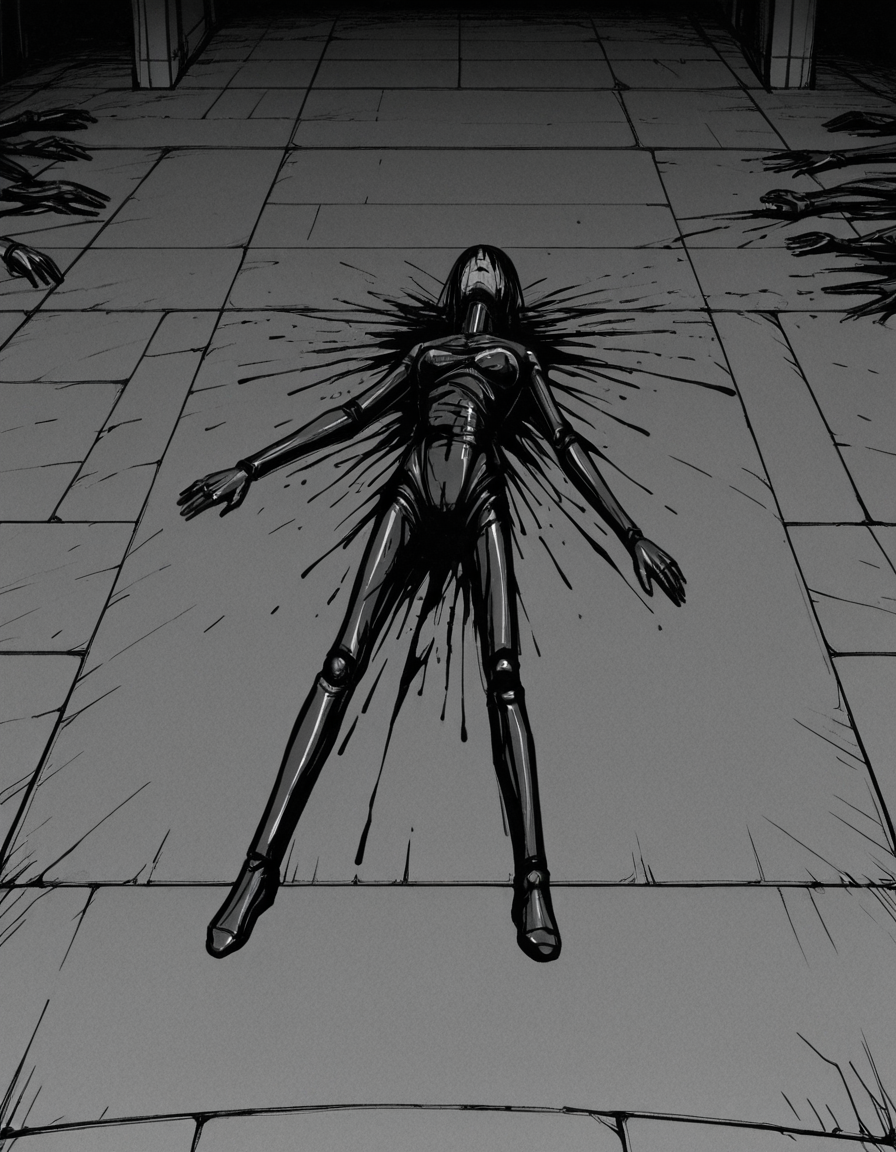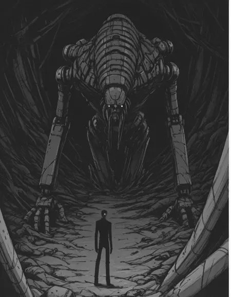 스타일을 더 강화하는 데 도움이 되는 유용한 태그: greyscale, monochrome, science fiction, humanoid robot, indoors, fog, dust, rock, debris, wire, industrial pipe