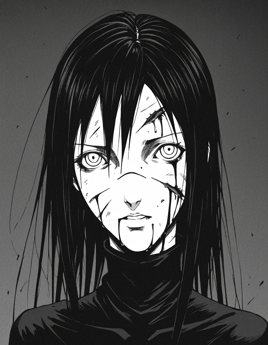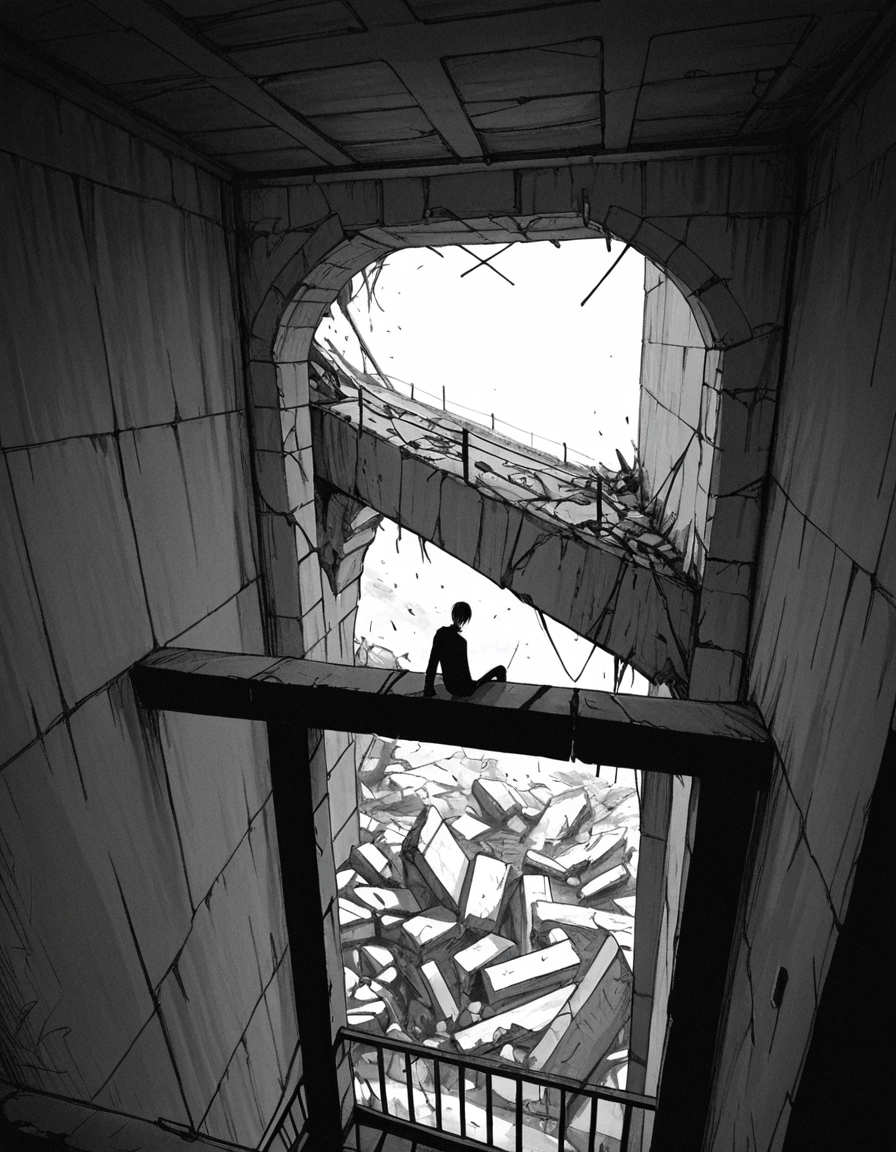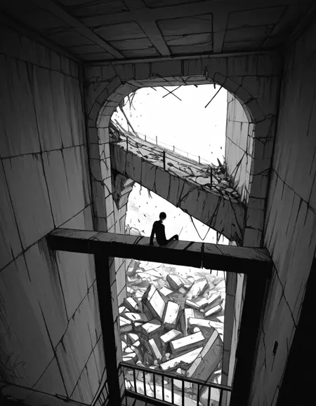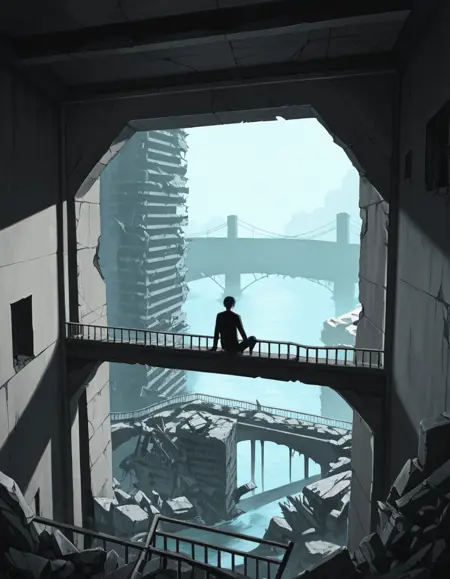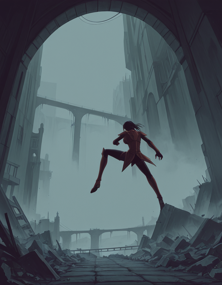 스타일을 더 강화하는 데 도움이 되는 유용한 태그: greyscale, monochrome, science fiction, humanoid robot, indoors, fog, dust, rock, debris, wire, industrial pipe