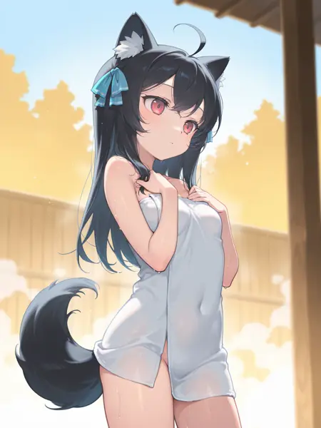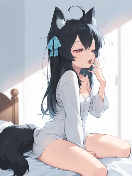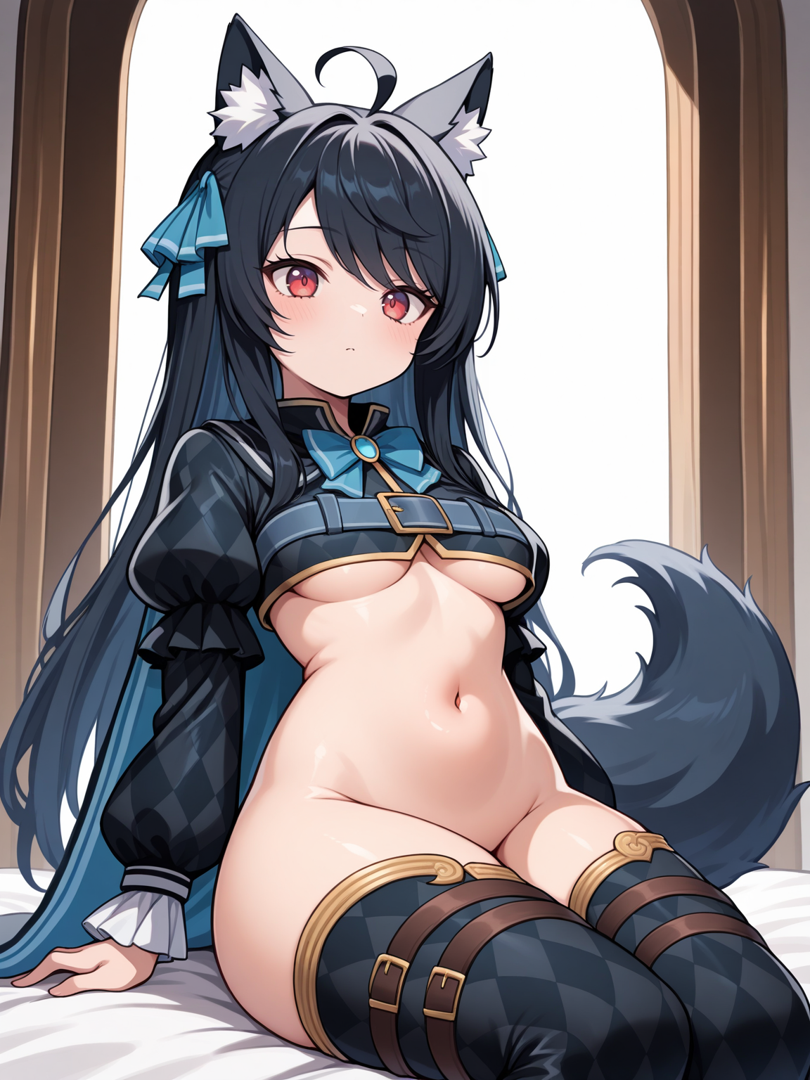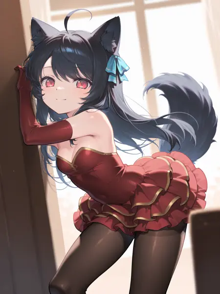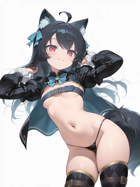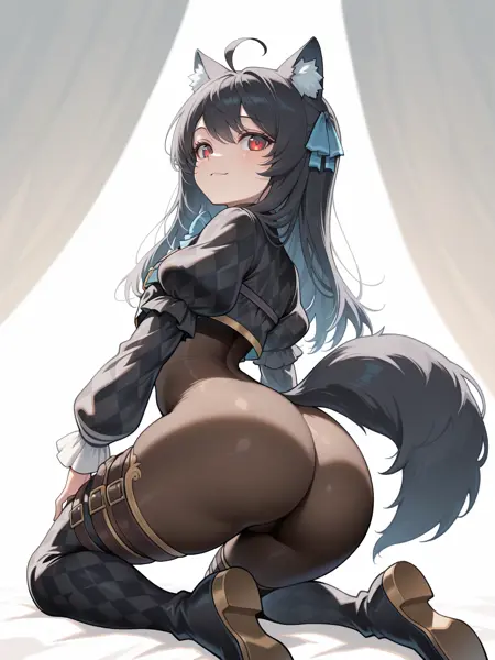 외모: ilsvartlilja, 검은 머리, 긴 머리, 붉은 눈, 늑대 귀, 늑대 꼬리, 아호게, 머리 리본
