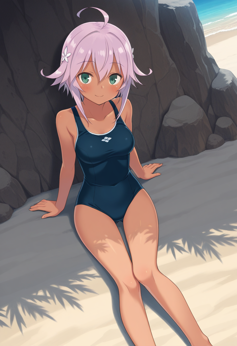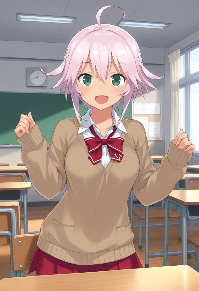 belkaBGR, ピンクの髪, 短い髪, アホ毛, 緑の目, 暗めの肌の女性