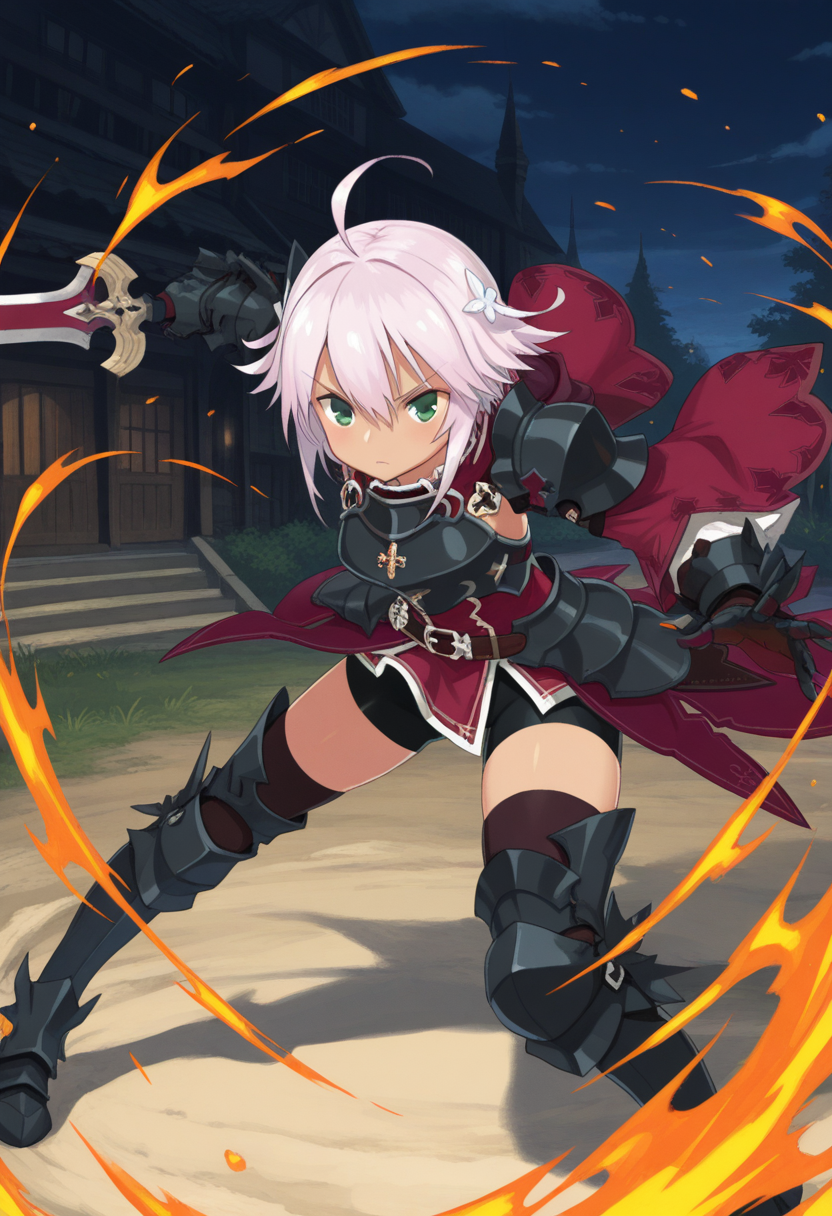 装甲ドレス、赤いドレス、パウルドロン、肩甲板、取り外し可能な袖、バイクショーツ、黒いショーツ、ガントレット、黒い太ももハイ、脛当て