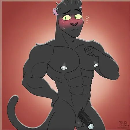 tyler, solo, black panther, anthro, furry, male, pecs, naked, nude, silver nipples, green eyes, yellow sclera, blush, (silver glans), black penis base, muscular, (scar on the right eye),