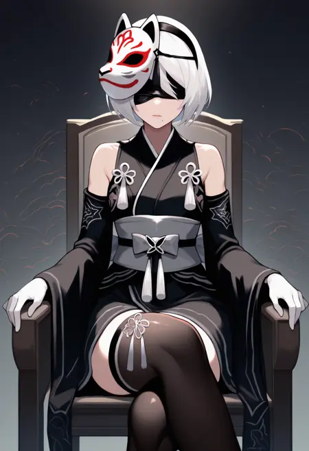 胜利女神:NIKKE: no2tbkimono, 嘴下有痣, 短发, 白发, 黑色发带, 狐狸面具, 面具戴在头上, 遮住眼睛, 黑色眼罩, 日本服饰, 流苏, 短款和服, 黑色和服, 无袖和服, 灰色腰带, 带扣, 可拆卸袖子, 宽袖, 白色手套, 黑色过膝袜, 裸露肩膀