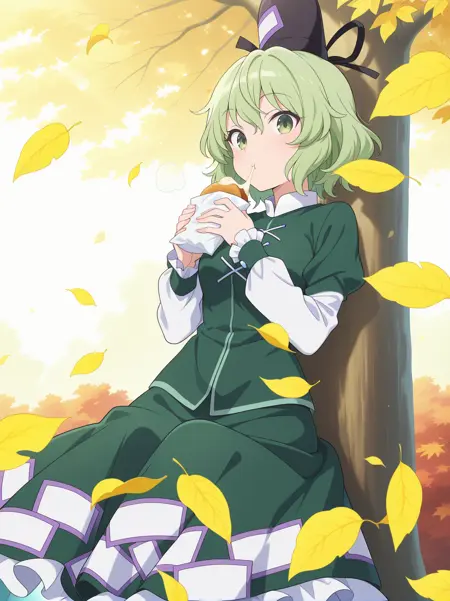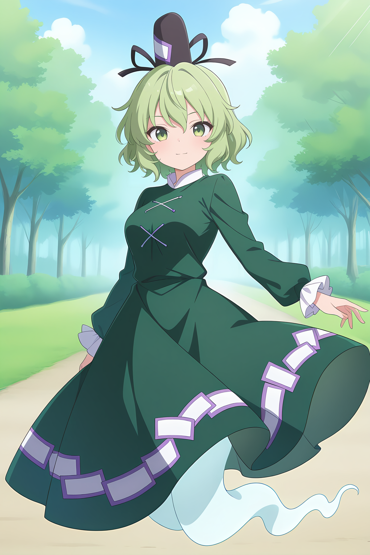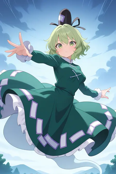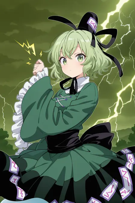 tate eboshi, black hat, green dress, cross-laced dress, long sleeves, frilled sleeves, ofuda on clothes,