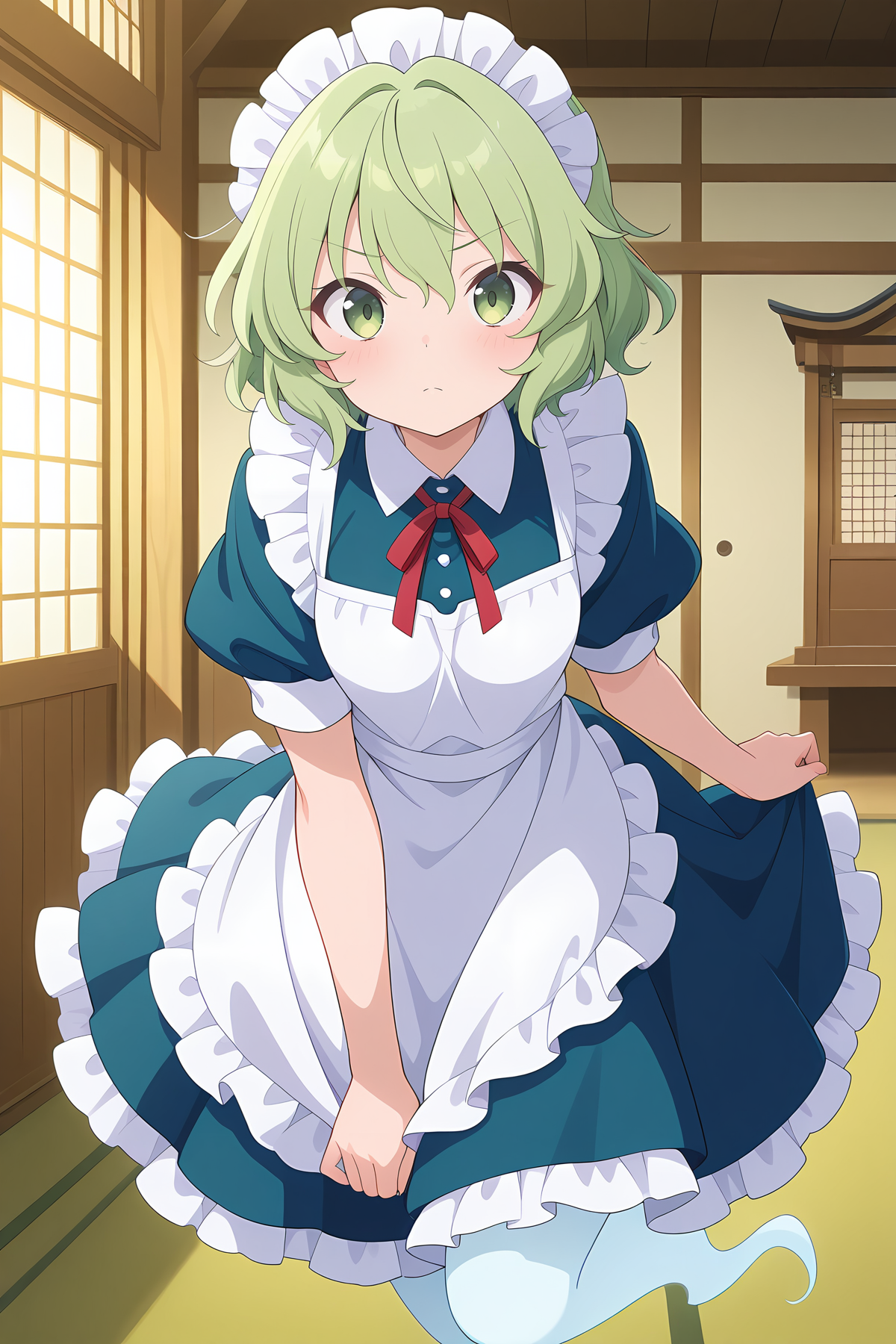 soga no tojiko, 1girl, solo, green eyes, green hair, short hair, alternate costume, ghost tail, ghost legs, braid, maid, maid headdress, apron, puffy sleeves, no hat, blue dress, blue maid, red neck ribbon, frilled dress,