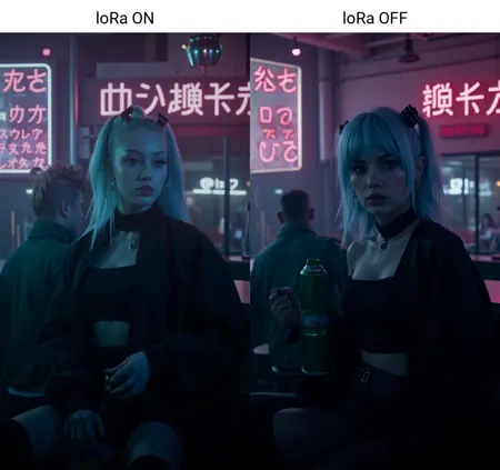 • 측면 카메라 각도로 촬영된 사진적 사실주의 장면. 네온 조명이 있는 어두운 바에 두 명의 캐릭터가 등장하는 스타일리시한 사이버펑크 장면입니다. 이미지 좌측에는 창백한 피부와 푸른 머리카락을 가진 여성이 바 카운터 의자에 앉아, 손에 녹색 탄산음료 캔을 들고 있습니다. 그녀는 진지한 표정을 하고 있으며, 검은 크롭탑과 검은 재킷을 입고 있습니다. 머리는 긴 머리카락에 머리핀으로 고정되어 있으며, 얼굴에는 푸른 아이섀도우를 바르고 있습니다. 검은 장갑을 끼고 있으며, 하복부에 문신이 있습니다. 배경에는 모하awk을 한 남성이 녹색 재킷을 입고 여성을 바라보며 서 있습니다. 바는 푸른색과 보라색의 네온 조명으로 채워져 있고, 뒷벽에는 일본어 문구가 적힌 간판이 있습니다.