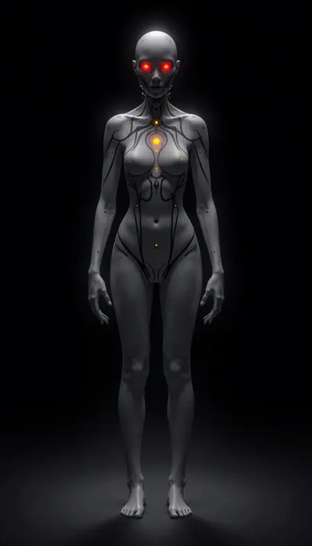 • 정면 카메라 각도로 촬영된 사진적 디지털 일러스트레이션. 매끄러운 검은색과 흰색 외관의 미래지향적 인간형 캐릭터로, 여러 전선과 투명한 안면 보호장치가 달린 인간형 로봇 머리를 가지고 있습니다. 이미지 중앙에는 창백한 피부와 검은 머리를 가진 20대 초반의 젊은 여성이 서 있으며, 마른 체형으로, 정면에 지퍼가 있는 검은 반짝이는 바디수트를 입고 있습니다. 표정은 중립적이며, 입은 약간 벌어져 있고, 눈은 관객을 직시하고 있습니다. 머리는 길고 곧은 검은 머리이며, 등 뒤로 흘러내립니다. 배경은 단색의 밝은 회색으로, 캐릭터의 매끄럽고 미래적인 디자인과 대비됩니다. 전체 미학은 최소화되어 있으며, 주인공의 표정과 전선, 안면 보호장치의 복잡한 디테일에 초점을 맞춥니다.