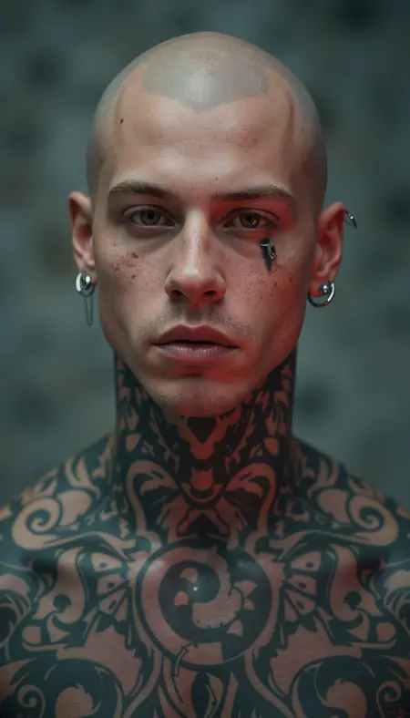 • 근접 카메라 각도로 촬영된 사진처럼 사실적인 초상화. 대머리 머리와 얼굴, 목에 복잡한 문신이 새겨진 남성의 초상. 표정은 중립적이다. 이미지 중앙에는 20대 후반으로 보이는 날씬한 체형의 남성이 카메라를 직시하며 서 있다. 얼굴 표정은 중립적이며, 머리는 밀어버렸다. 귀와 목에 여러 개의 피어싱이 있으며, 그 중에는 귀걸이가 있다. 몸 전체에는 복잡한 문신이 새겨져 있고, 코에는 점이 있다. 배경은 흐릿하게 처리되어 있으며, 회색과 흰색 톤의 실내 공간으로 보인다. 조명은 부드럽고 확산되어 남성의 얼굴에 부드러운 그림자를 드리운다.