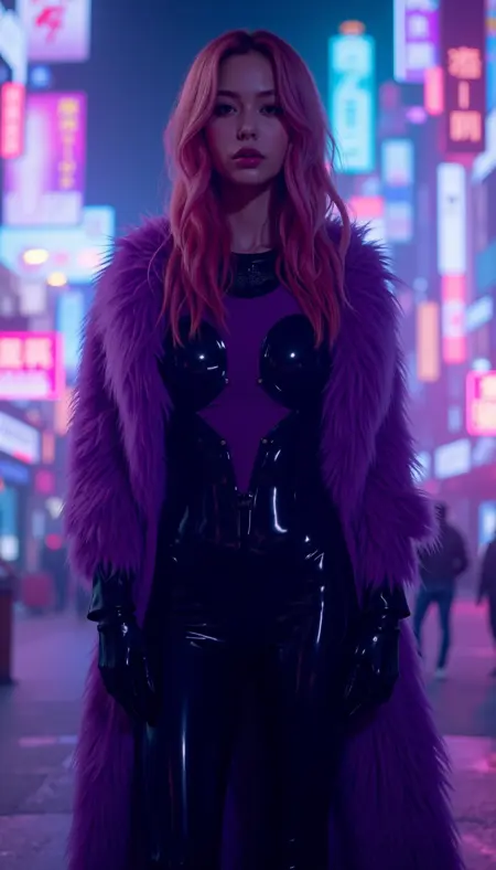 • 네온 조명이 밝힌 도시 환경에 자신감 있게 서 있는 미래적 사이버네틱 여성의 정면 카메라 각도에서 촬영한 사진처럼 사실적인 장면. 이미지는 사이버펑크 미학을 보여준다. 이미지 중앙에는 긴 곱슬 검정갈색 머리카락을 지닌 20대 중반의 여성이 자부심 어린 표정으로 허리에 손을 얹고 서 있다. 그녀는 날씬한 금속 신체와 자신감 있는 표정을 지니고 있으며, 털이 달린 보라색 외투에 털 장식을 하고, 검정 금속 바디수트를 입고 있다. 배경은 화려한 네온 간판과 조명으로 구성되어 생동감 있고 미래적인 분위기를 연출한다.