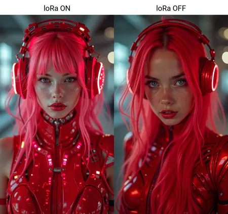 • 근접 카메라 각도로 촬영된 사진적 사실주의 장면. 밝은 빨간 머리와 로봇적 특징을 가진 미래지향적인 여성 캐릭터가, 빛나는 요소가 있는 빨간 헤드폰을 착용하고 있습니다. 이미지 중앙에는 창백한 피부, 파란 눈, 긴 분홍색 머리를 가진 젊은 여성이 있습니다. 그녀는 복잡한 기계적 디테일이 있는 빨간 미래지향적인 복장을 입고 있으며, 진지한 표정으로 관객을 직시하고 있습니다. 배경은 흐려져 있으며, 내부 공간처럼 보이며 부드러운 조명과 산업적 요소가 미래적이고 사이언스 픽션 분위기를 자아냅니다. 그녀는 마른 체형이며, 긴 머리에 앞머리가 있습니다. 눈은 크고 파랗고, 눈썹도 파란색입니다. 분홍색 립스틱과 얼굴에 주근깨가 있습니다. 표정은 중립적이며, 입은 약간 벌어져 있습니다. 전체 분위기는 강렬하고 미래적입니다.