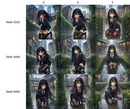 在负值权重下,背景的近景会显著变清晰,远处细节如楼房等立面的复杂度会增加,人物头发及衣服线条细节增加。在正值权重下,背景变得更模糊,人物的线条细节也会得到简化。需注意,对于一些2D模型,由于线条和色块的复杂度也被用于区分不同的风格,所以当你在使用这个LoRA改变细节时,也会对2D画风有一定影响。