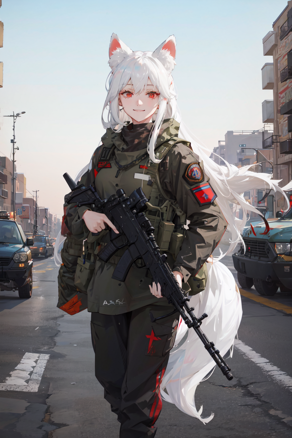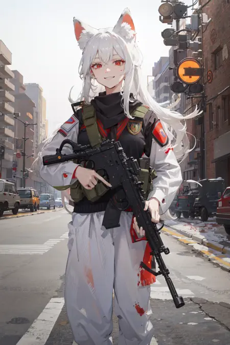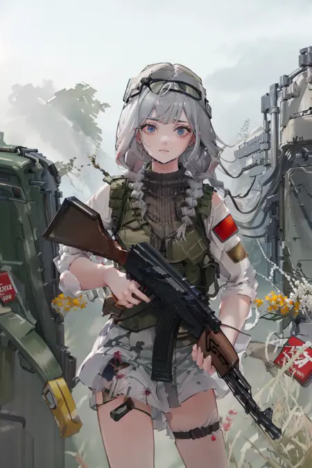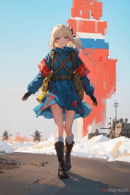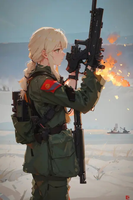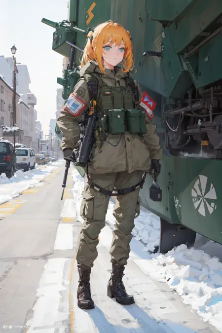 !! WARNING !! Additional military tags are not required, they can change clothes, for example, leave only body armor. Use just this model trigger words. "1girl, solo, militaryru, lora:militarytyan:1,"