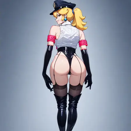 elbow gloves, armband, collared shirt, leotard, necktie, peaked cap, garter straps, thigh boots,