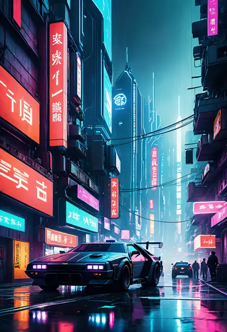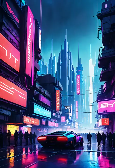 Creates a variant of cyberpunk art, first pass for RokuPunk. (Tags:scenery, outdoors, building, sky, no humans, city, cityscape, cloud, night, tree, road, water, cloudy sky, science fiction, skyscraper, city lights, reflection, bridge, sunset, night sky, street neon lights,realistic, cyberpunk)